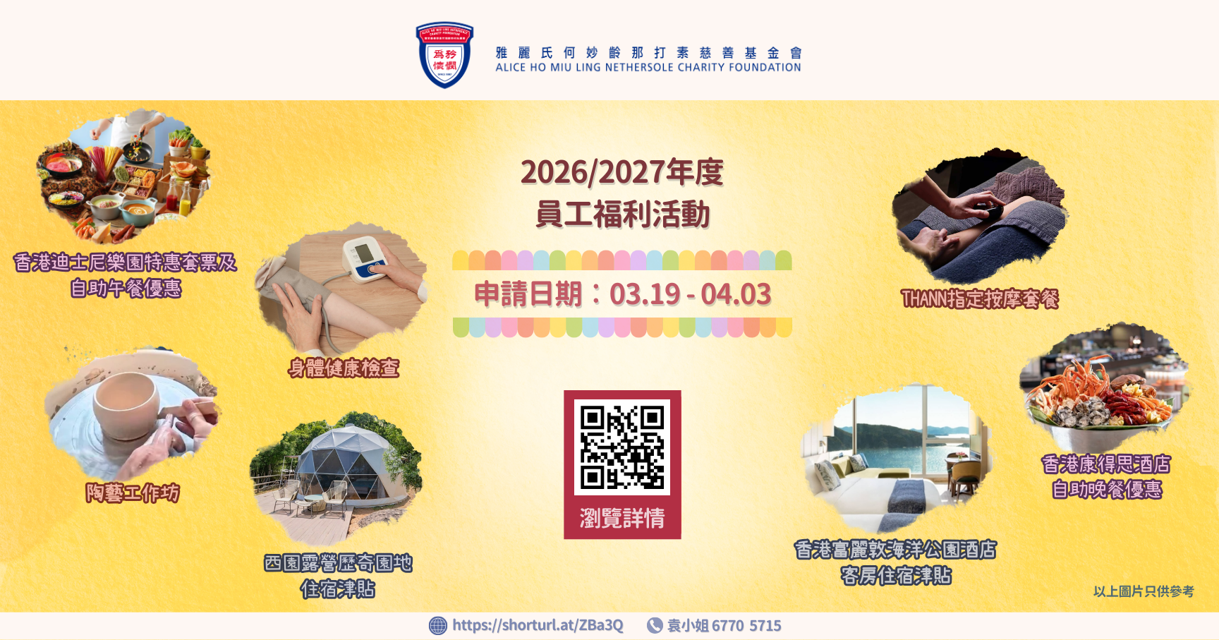 今年度繼續資助項員工福利活動,包括主題樂園特惠套票及自助午餐優惠、酒店客房住宿津貼、西園露營歷奇園地住宿津貼、陶藝工作坊優惠、自助晚餐優惠、按摩套餐、身體健康檢查及員工健康日。活動詳情如下,期待你們的參與﹗