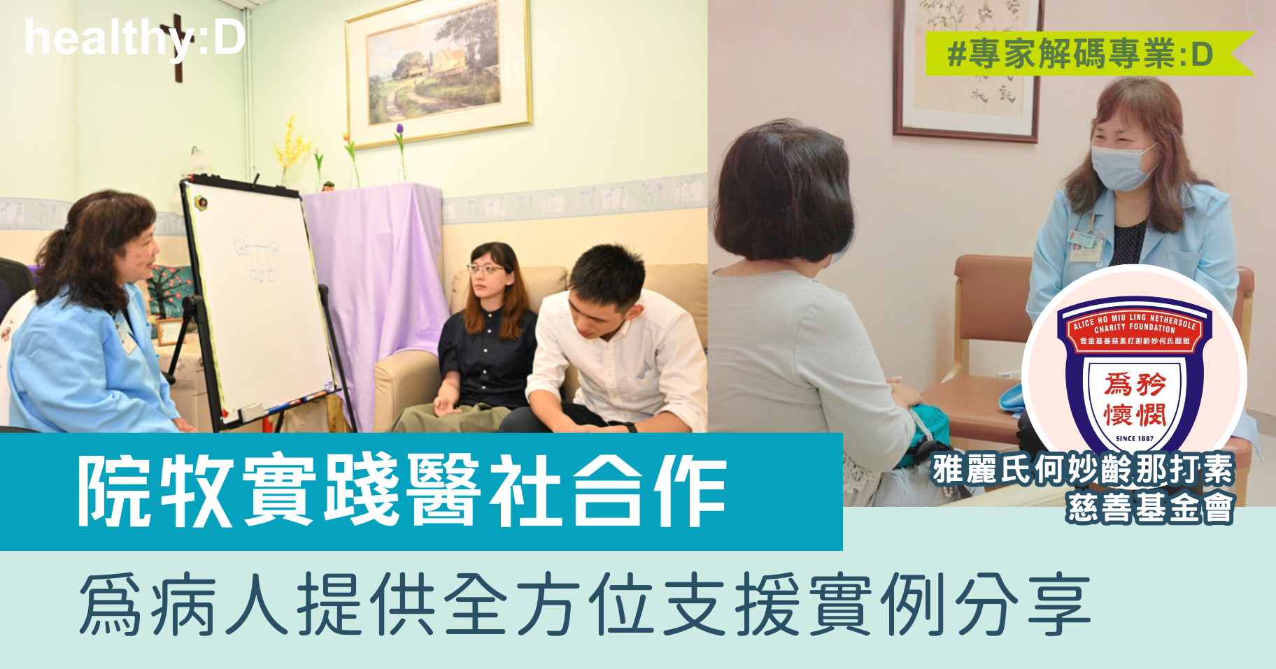 雅麗氏何妙齡那打素醫院院牧部作為醫療團隊的一員,除了提供直接的靈性關懷與情緒支援,更在適當時機辨識病人更深層的需要,連結社區資源,讓病人獲得更全面和持續的幫助。